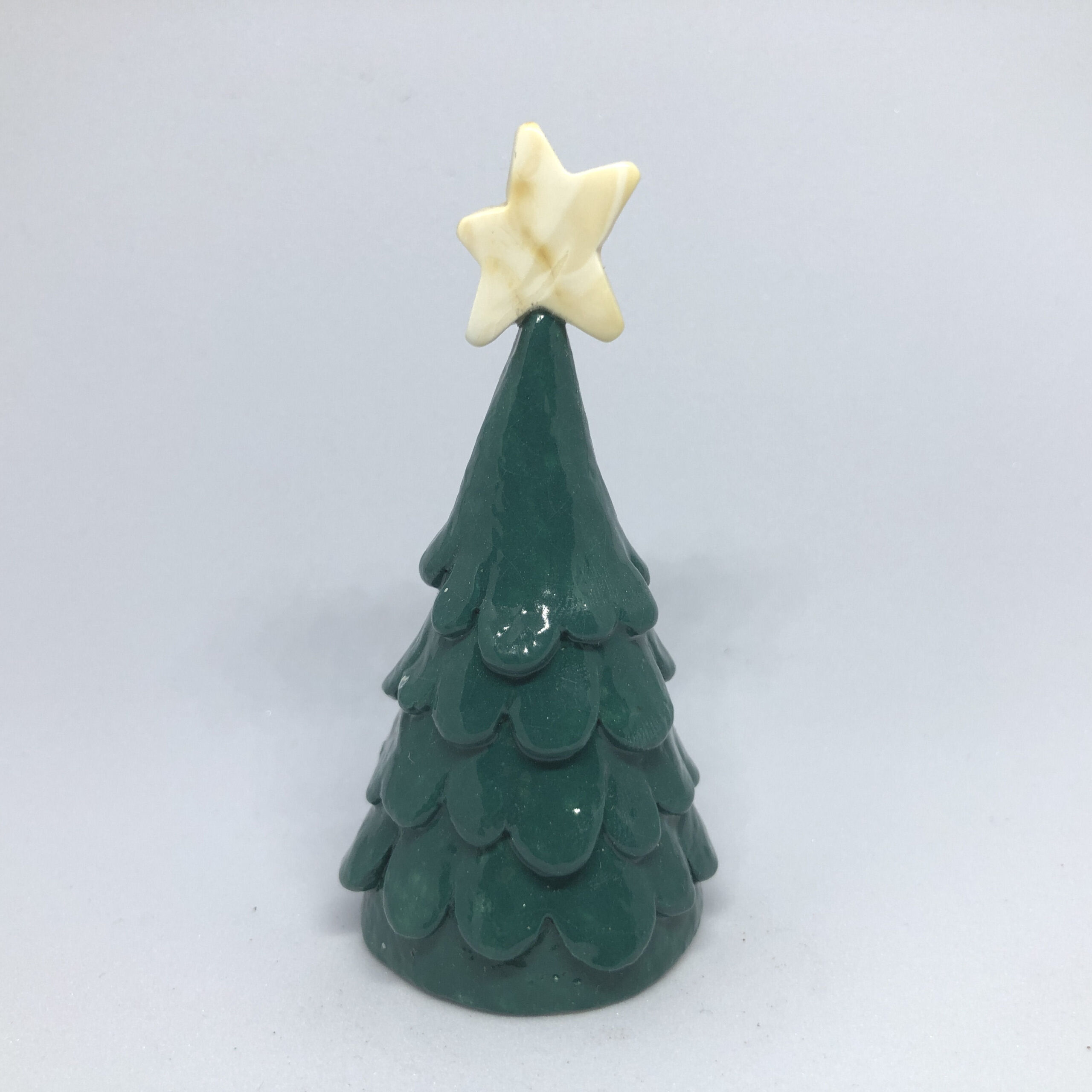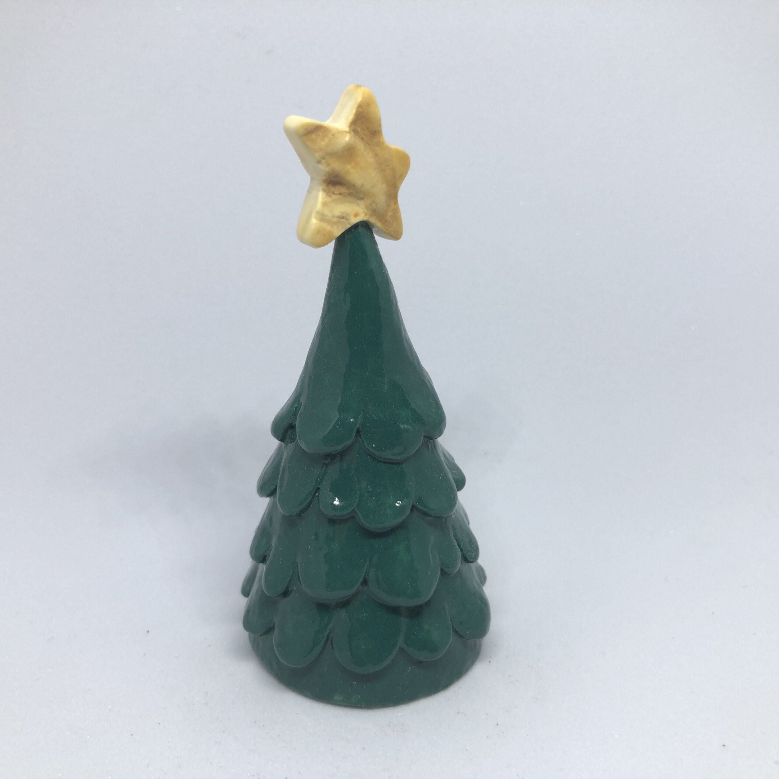 Bedårende juletræ med magisk ravjulestjerne. Julestjernen er fem-takket og er slebet af helt rent og fint mælkerav, med en fantastisk hvid farve. Stjernen er slebet og poleret helt glat og blank på den ene side, mens den anden side er bevaret i sin rå rustikke form. Juletræet er udført i keramik og har en flot grøn gran farve.