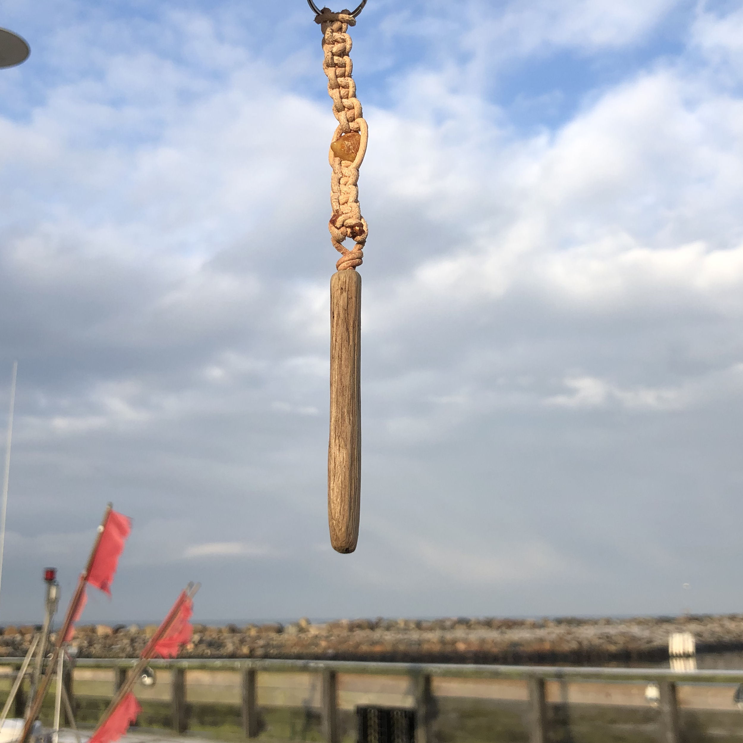 En yndefuld lang nøglering. Nøgleringen er knyttet i naturlæder og bærer et flot stykke rav, med et flot farvespil. Nøgleringen er afsluttet med et fint aflangt stykke drivtømmer med en let grov struktur.