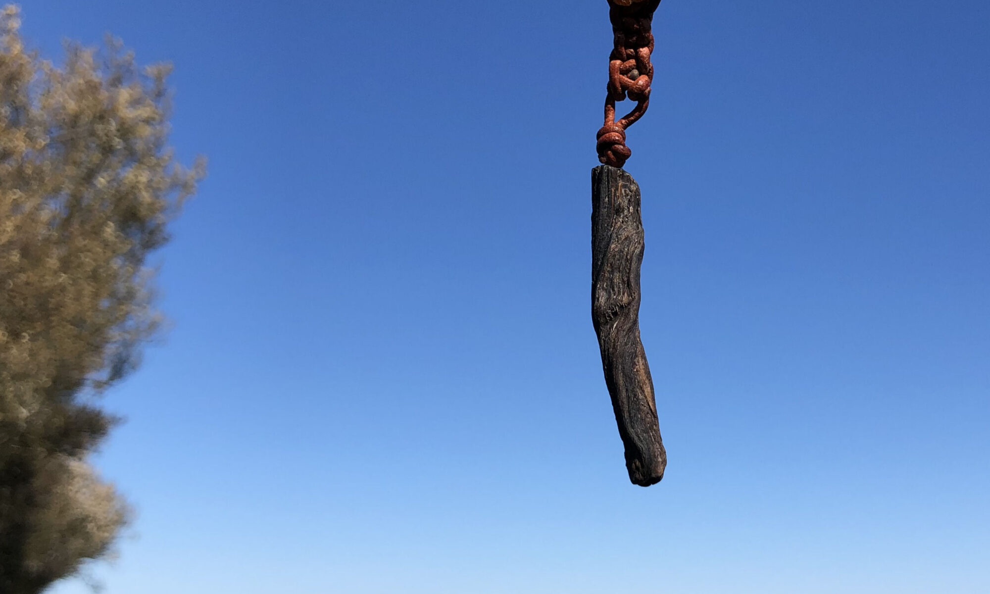 Fin nøglering med et dejligt stykke klart gult rav. Nøgleringen er knyttet i brunt læder og har et sjovt mørkt og kroget stykke drivtømmer som afslutning.